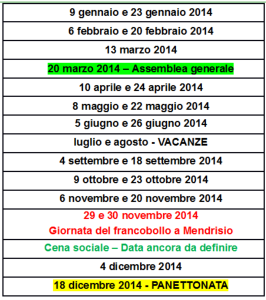 21 marzo 2013Assemblea generale 13-15 sett 2013GLABRA 2013Esposizione nazionale di rango II a Näfels 29 nov 2013 cena sociale, Ristorante Roncheto di Comano 13-15 dic 2013aarphila13, Esposizione nazionale di rango III, “Giornata del franco boillo” ad Aarau14-15 dic 2013 “Giornata del francobollo” Mendrisio nella Galleria Baumgartner di Mendrisio assieme agli amici del Circolo Filatelico di Lugano 19 dic 2013 panettonata e augiri per il NUOVO ANNO, Bar Americano